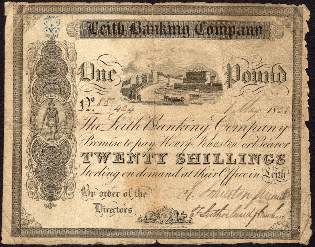 Scotland. Leith Banking Company. 1 Pound. 1 May 1833. D.6b. No. 85/424. Waterfront scene at center, Bonnie Prince Charlie with Gaelic and Latin legend left. "Promise to pay the Bearer on demand One Pound One Shilling Stg". Very Good-Fine.