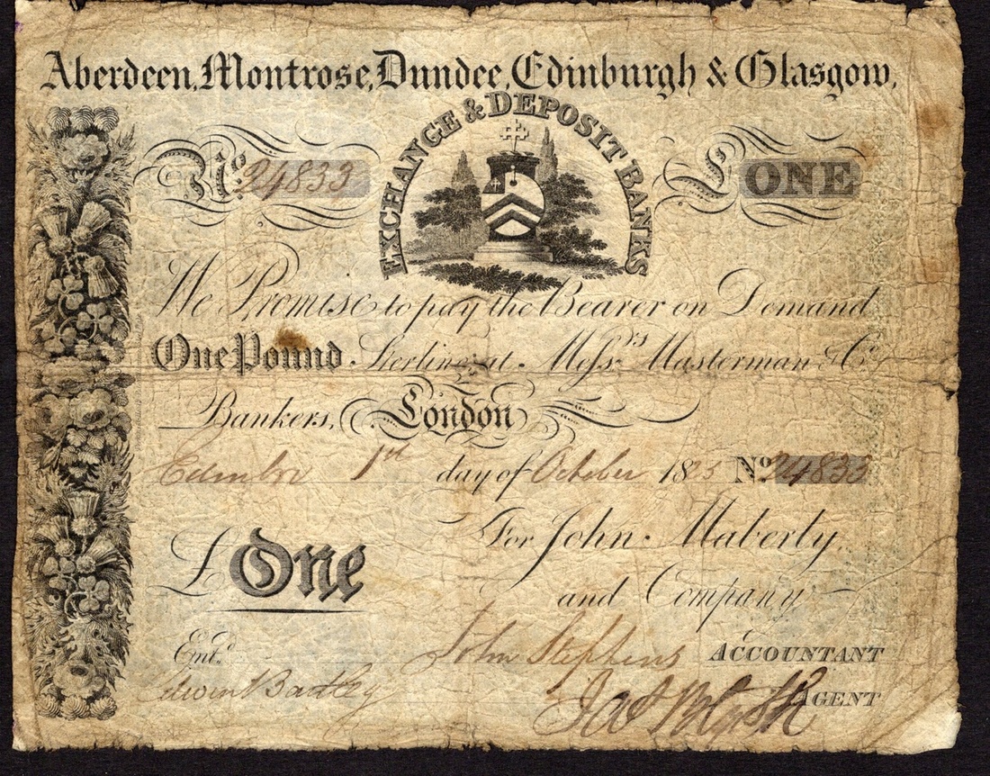 Scotland. John Maberly & Co. Aberdeen, Montrose, Dundee, Edinburgh & Glasgow Bank. 1 Pound. Edinburgh, 1 October 1825. D.3. No. 24833. Arms top center, vertical panel of roses and thistles at left, black and red revenue stamp on back. Some soiling, light margin nicks. About Fine. Chartered Institute of Bankers in Scotland pedigree.