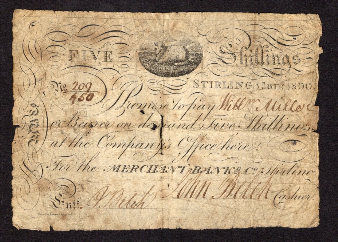Scotland. Merchant Banking Company. 5 Shillings. Stirling, 6th Jan. 1800. PMS SM1. No. 209/450. Black and white. Lamb at top center, bank initials left, two manuscript signatures below. Kirkwood engraving. Some tears and holes along central folds. About Very Good and Rare. Ex Dix, Noonan Webb Sale, August 26, 2021, lot 349.
