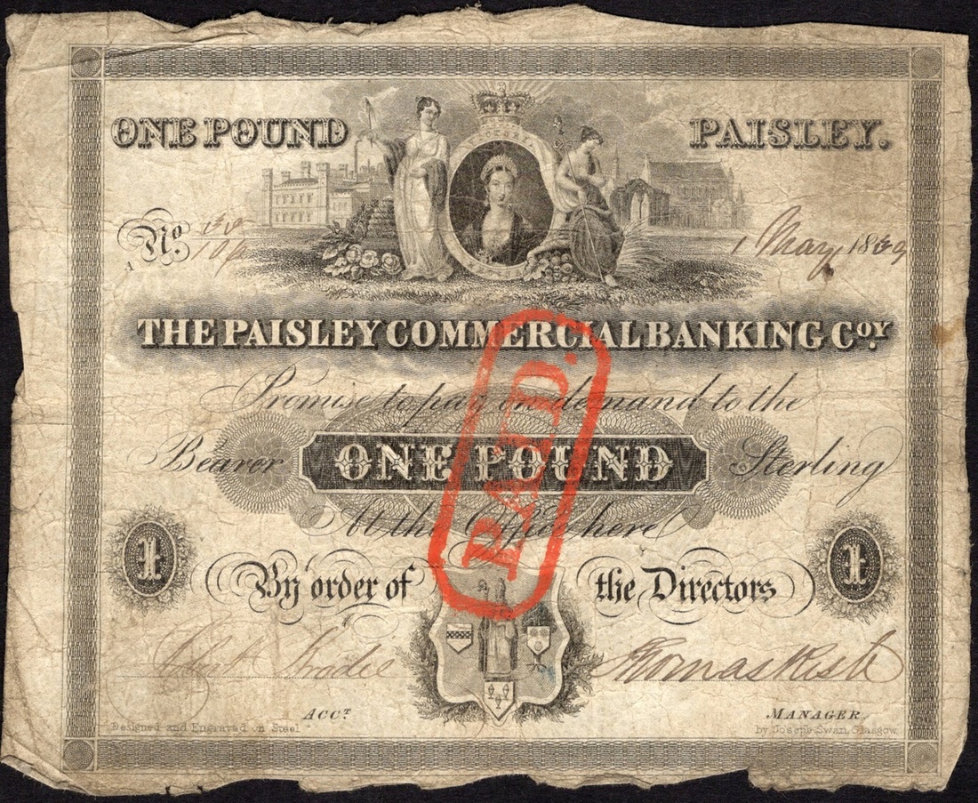 Scotland. Paisley Commercial Banking Company. 1 Pound. 1 May 1839. PMS PC1. No. 39/109. Vignette of the young Queen Victoria flanked by Industry and Abundance top center, Arms at bottom flanked by hand-signed signatures; revenue stamp on back. Red PAID stamp front center. The bank was established to compete with Paisley's two other existing banks. It was acquired by the Western Bank of Scotland in 1844. Rare. Very Good. Ex Ken Norris Collection, Spink, July 27, 2023, lot 520.