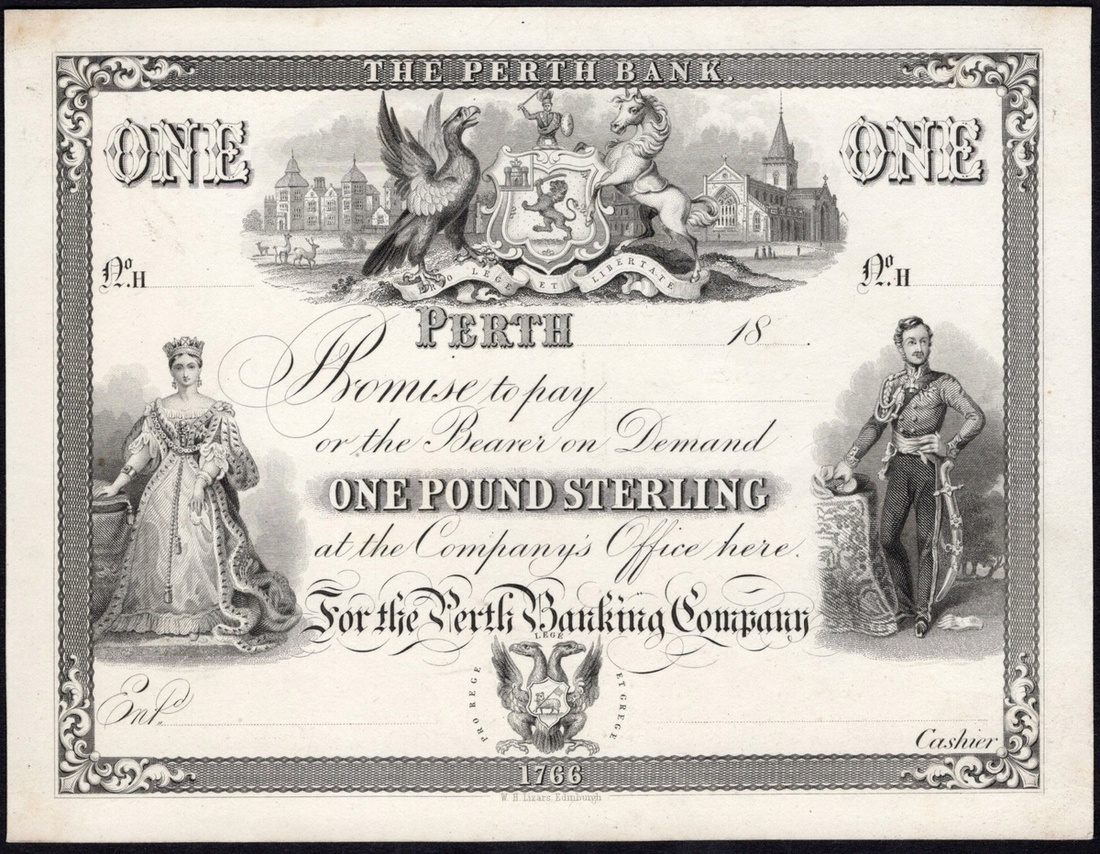 Scotland. Perth Banking Company. 1 Pound Proof. 18xx. D.11. A young Queen Victoria standing at left, Prince Albert standing at right, Arms top center. An attractive Proof by W.H. Lizars, one of the top security printing companies in the mid-19th Century. Extremely Fine. Ex St. James Auction, Oct.13, 2004, lot 651.