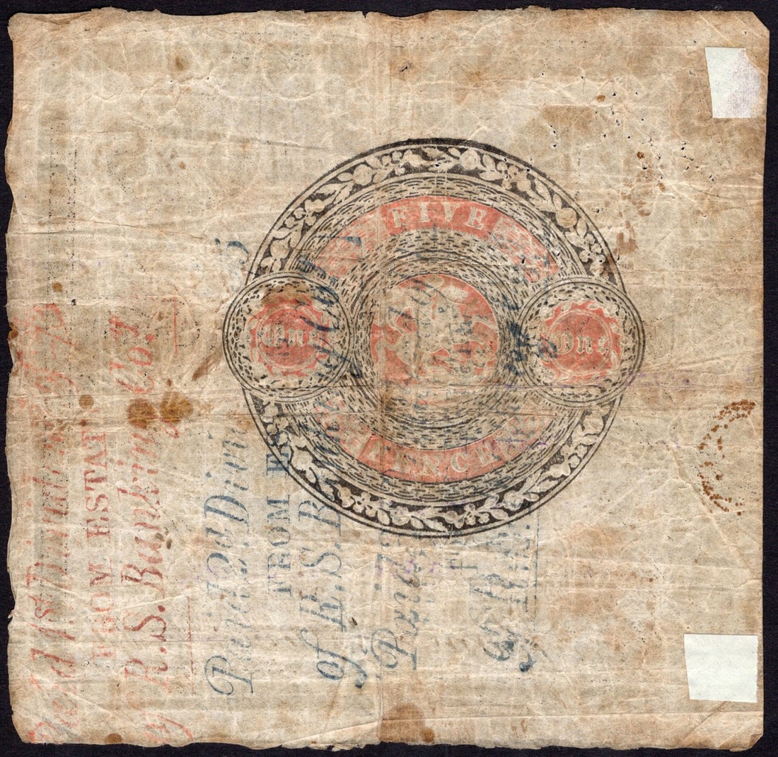Scotland. Renfrewshire Banking Company. 1 Pound. 11 Nov. 1836. D.3. No. 16-4802.  Abundance standing by cornucopia top center, three manuscript signatures, stamped "Ranked" in red on front, three dividend payment stamps on back. Very Good-About Fine, two small tape mounts on back.