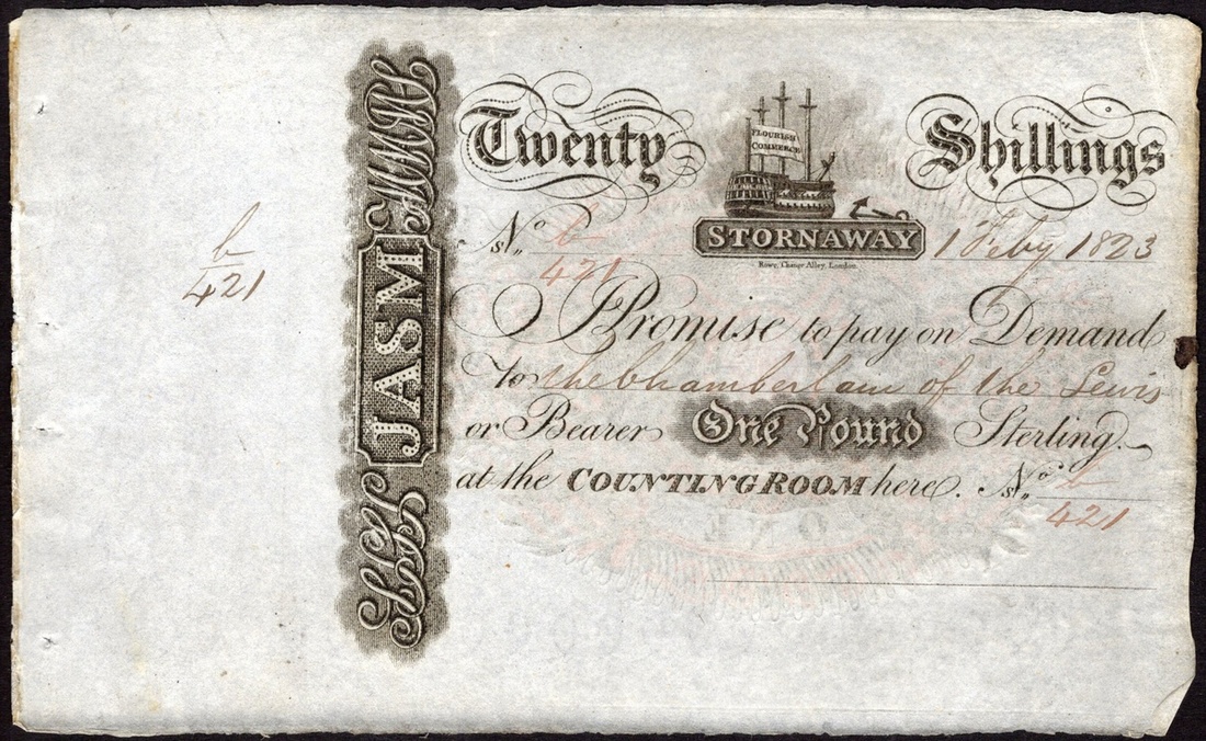 Scotland. Stornoway - J. Stewart McKenzie. 20 Shillings. 1 Febr. 1823. PR.190. No. B/421. "Flourish Commerce" galleon upper center; red and black tax stamp on back. Unissued. About Extremely Fine