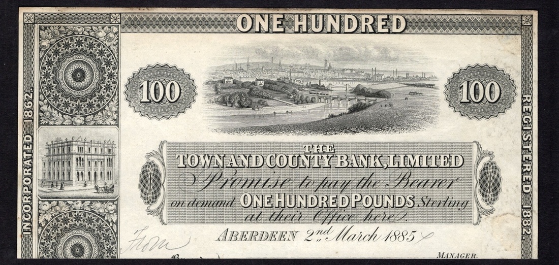 Scotland. Town and County Bank. Proof 100 Pounds. Aberdeen, 2nd March 1885. D-15. Black and white. View of Aberdeen top center, bank head office at center of left panel. By Perkins Bacon & Co. Cut above bottom margin, thinning on one corner. Otherwise Good Very Fine.