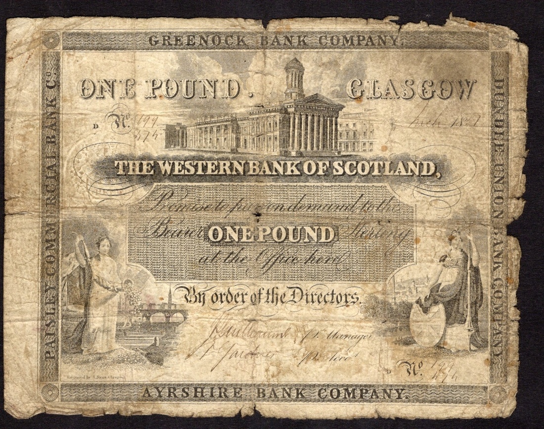 Scotland. Western Bank of Scotland. 1 Pound. 1857. D.6. Handwritten serial No. 199/474. Bank building upper center, Abundance lower left, Scotia lower right. Very Good, pinholes, a few tiny body splits, edge wear, missing small piece right margin and 10mm tear, otherwise intact and Rare.