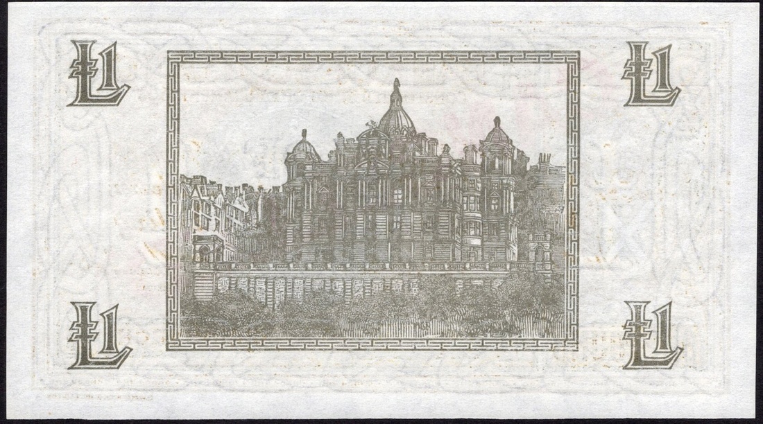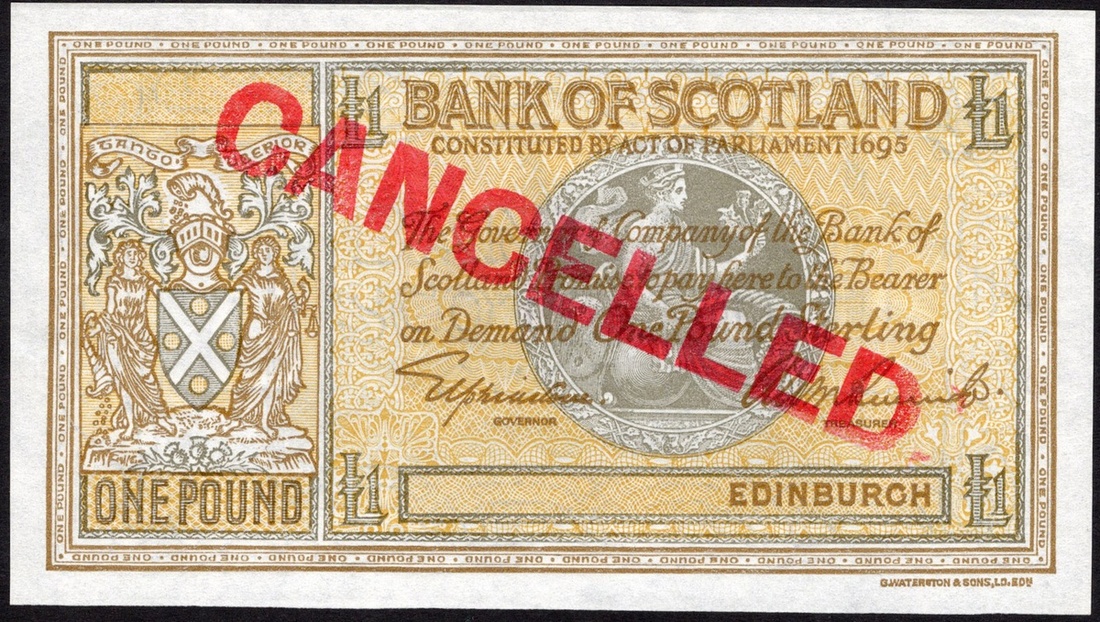 Scotland. Bank of Scotland. Proof 1 Pound. Ca. 1935-1937. D.86-2. Yellow-brown and gray. Fortuna medallion at center, bank Arms in panel at left; bank building on back. Large red diagonal CANCELLED. The change in design arose from objections to the Royal Arms used by the bank. Rare. Uncirculated.