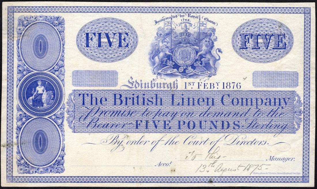 Scotland. British Linen Bank. Proof 5 Pounds. Edinburgh, 1st February 1876. Blue and white, large format. Britannia seated facing at left, Arms upper center. "to this 13th August 1875" in pencil lower right. Slight marks, otherwise Extremely Fine. Ex Spink Sale, June 10, 1995, lot 314, Perkins Bacon Archive.