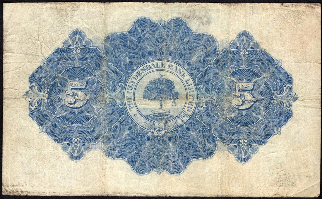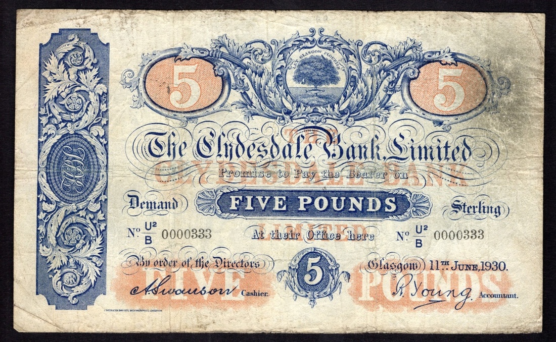 Scotland. Clydesdale Bank, Limited. 5 Pounds. Glasgow, 11th June 1930. D.16-2, P-186. No. U2/B 0000333. Blue and red. Glasgow Arms upper center. Fine, some soiling right margin.