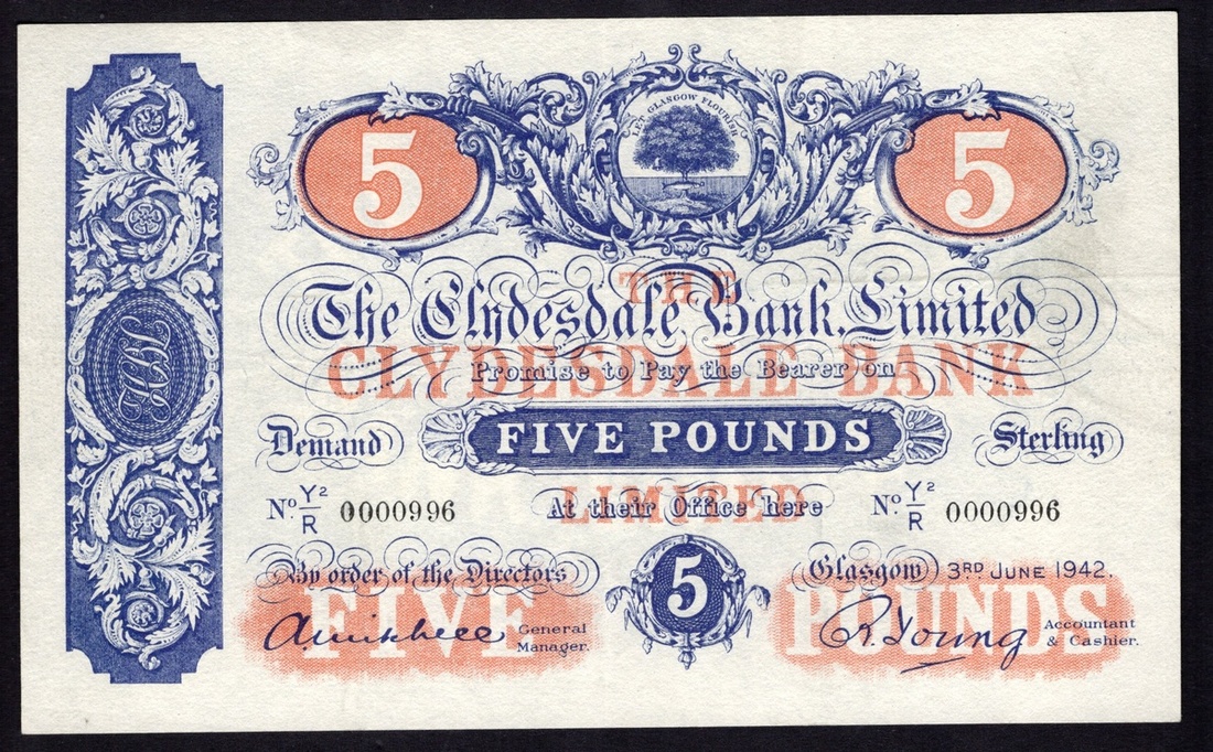 Scotland. Clydesdale Bank, Limited. 5 Pounds. Glasgow, 3rd June 1942. P-186. No. Y2/R 0000996. Blue and red. Glasgow Arms upper center. Extremely Fine.