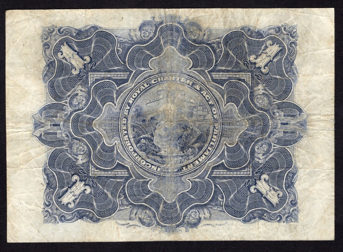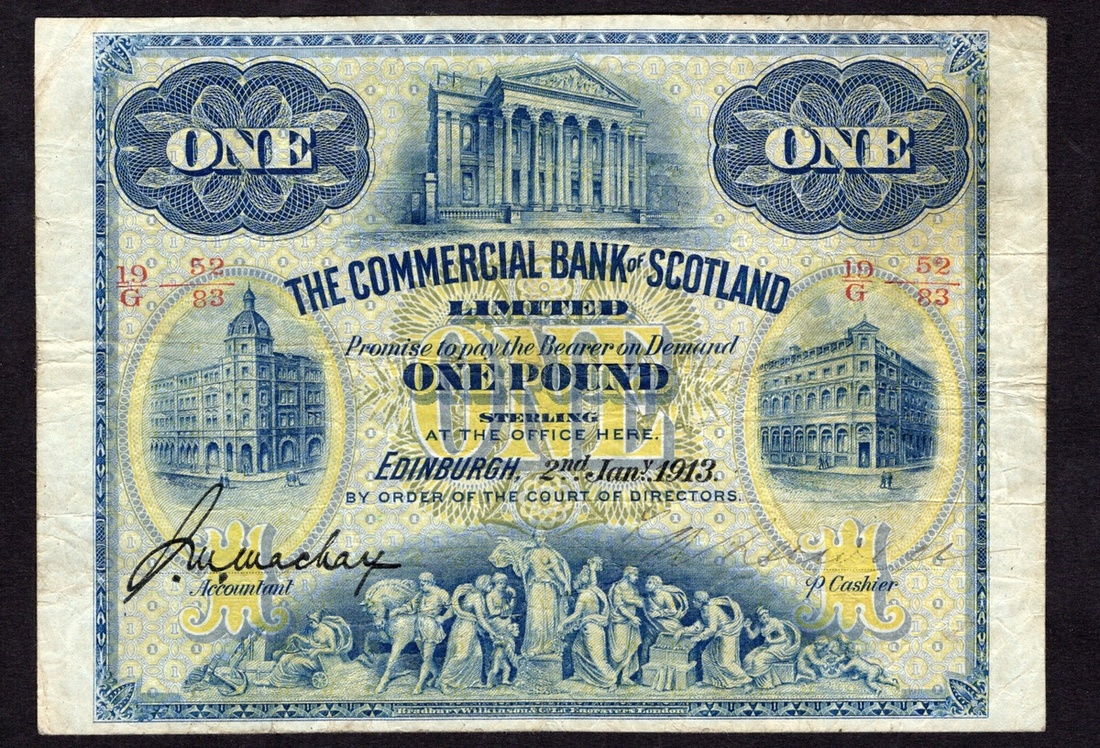 Scotland. Commercial Bank of Scotland Limited. 1 Pound. Edinburgh, 2nd Jan. 1913. P-S323a. No. 19/G 52/83. Mackay and one other manuscript signature. Blue and pale orange, blue-gray back. Bank building upper center, edifices left and right, group of allegorical figures lower; Seal back center.