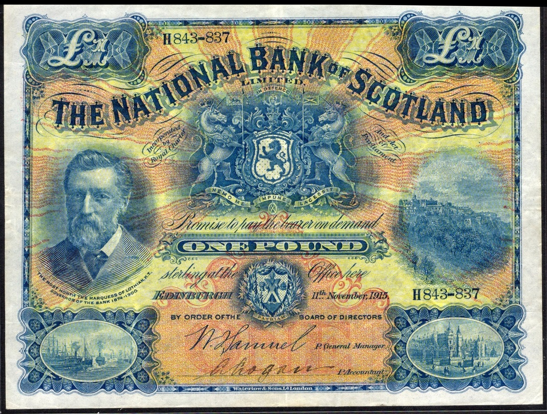 Scotland. National Bank of Scotland Limited. 1 Pound. Edinburgh, 11th November 1915. D.24-1; P-248a. No. H843-837. Blue, yellow, orange-red sunburst. Printed signature of W. Samuel for General Manager, and manuscript signature on behalf of Accountant. Royal Arms at center, Marquess of Lothian at left, Edinburgh Castle at right, Clyde shipping scene lower left, Palace of Holyroodhouse lower right. Very Fine. Ex. Dr. R.W. Pringle Collection, Banking Memorabilia Sale, April 23, 2005, lot 147.