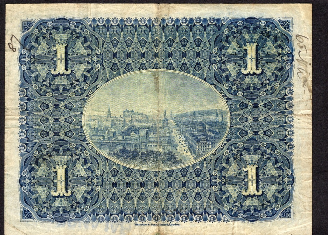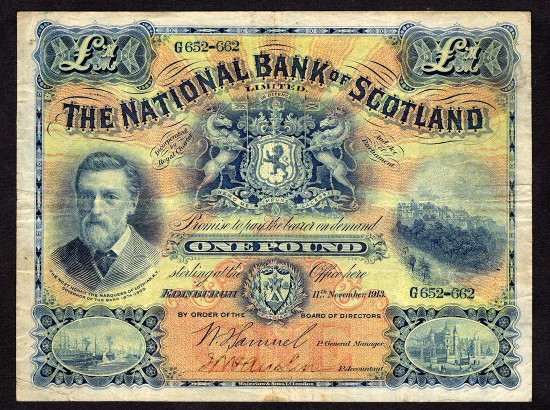 Scotland. National Bank of Scotland Limited. 1 Pound. Edinburgh, 11th November 1913. P-248a. No. G652-662. Blue, yellow and orange-red. Marquess of Lothian at left, Arms at center, ships lower left, Edinburgh Castle lower right; Cityview back center. Inked numbers back margin. Fine.