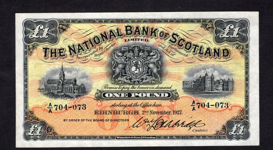 Scotland. National Bank of Scotland Limited. 1 Pound. Edinburgh, 2nd November 1927. PMS NA 43, P-256. No. A/A 704-073. Leithbridge signature. Black, yellow and orange-red. Glasgow Cathedral at left, Holyrood Palace right, Arms at center; Princess Street, Edinburgh with Scott monument back center. Good Very Fine.