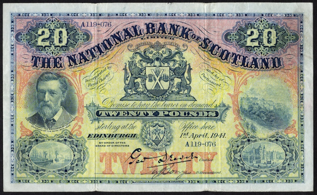 Scotland. National Bank of Scotland. 20 Pounds. 1st April 1941. D.36-1; P-260a. No. A119-076. Blue, yellow, pink and orange. Marquess of Lothian at left, harbor view below, Arms upper center, cityviews right. Scarce. Tiny ink stain top center back margin. Very Fine. Ex Spink Sale, April 12, 2005, lot 1172.