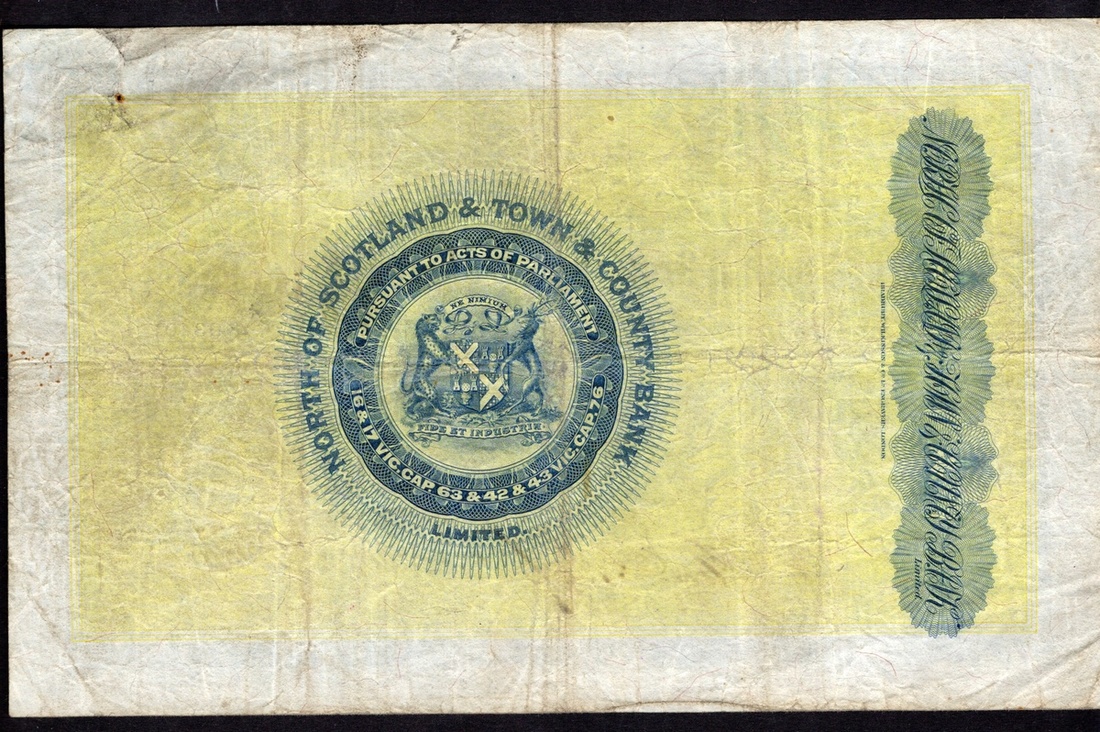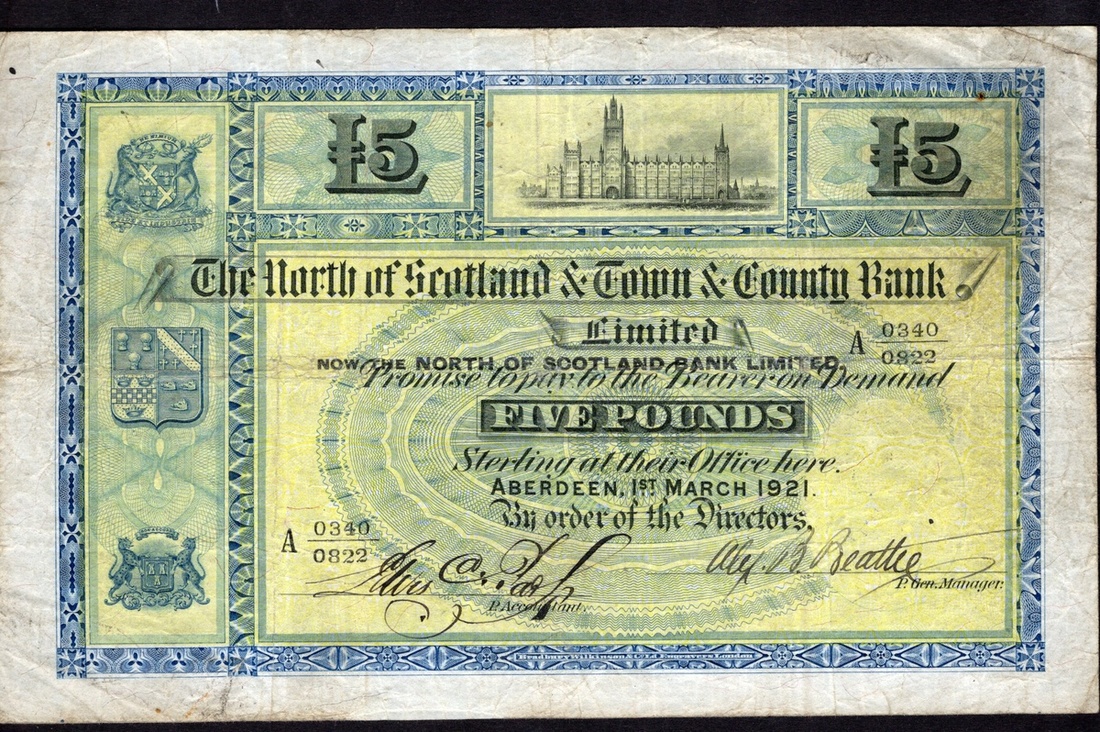 Scotland. North of Scotland & Town & County Bank. 5 Pounds. Aberdeen, 1st March 1921. D.16-5. No. A 0340/0822. Marischal College top center, three coats of arms at left; Arms on back. Fine.