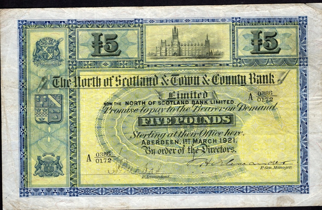 Scotland. North of Scotland & Town & County Bank. 5 Pounds. Aberdeen, 1st March 1921. D.16-6. No. A 0385/0172. Marischal College top center, three coats of arms at left; Arms on back. Printed overprint with six additional denomination marks on back. Rare. Fine.