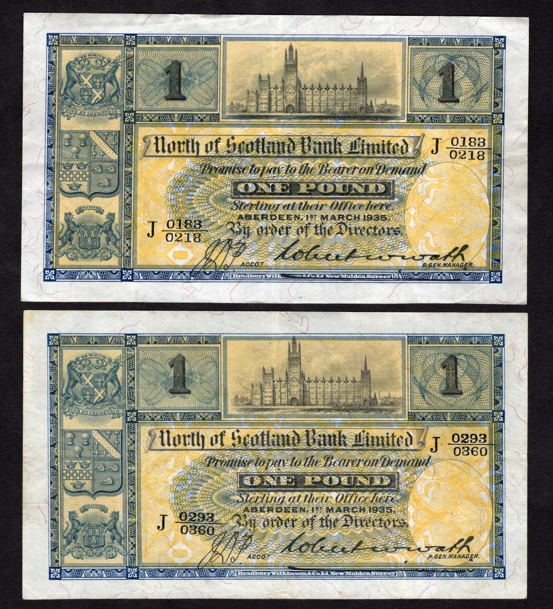 Scotland. North of Scotland Bank Limited. Pair of 1 Pound notes. Aberdeen, 1st March 1935. D.28-2; P-S639. Marischal College top center, three coats of arms at left; Arms on back. Very Fine. [2]