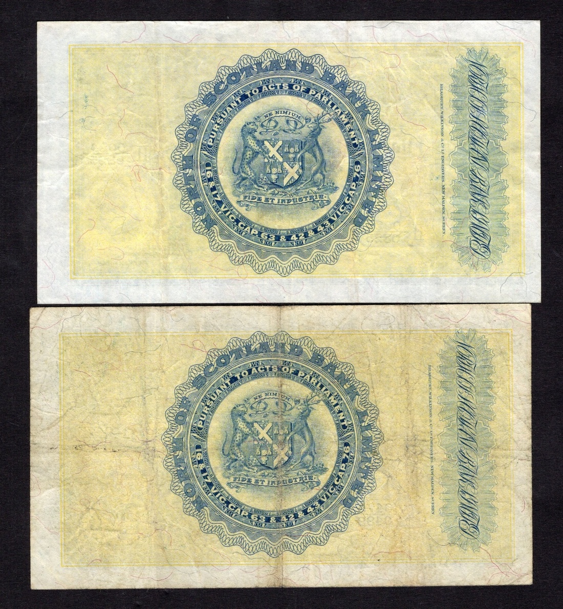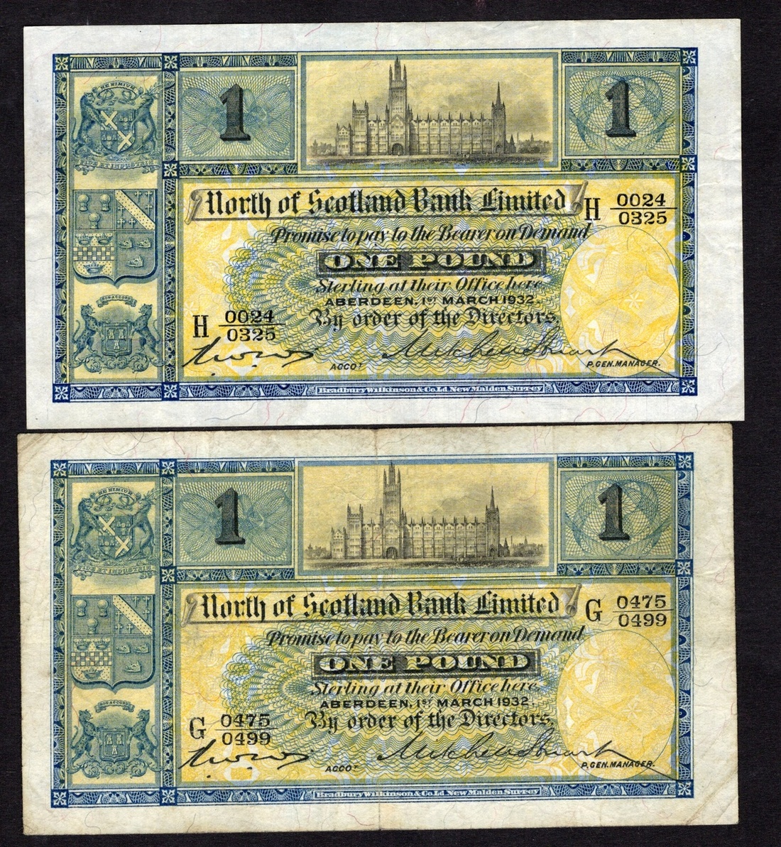 Scotland. North of Scotland Bank Limited. Pair of 1 Pound notes. Aberdeen, 1st March 1932. D.28-1; P-S639. Marischal College top center, three coats of arms at left; Arms on back. Fine and Very Fine. [2]
