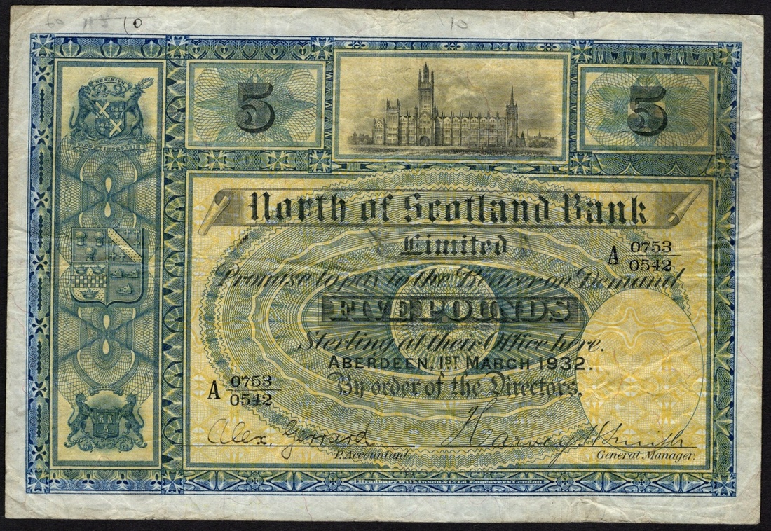 Scotland. North of Scotland Bank Limited. 5 Pounds. 1st March 1932. D.15-2; P-S640a. No. A 0753/0542. Blue and green on yellow. Marischal College top center. Inked numbers in margins. Fine. Ex Spink Sale, Oct. 2, 2003, lot 922.