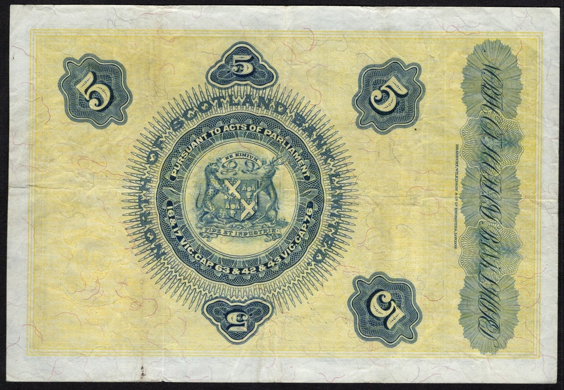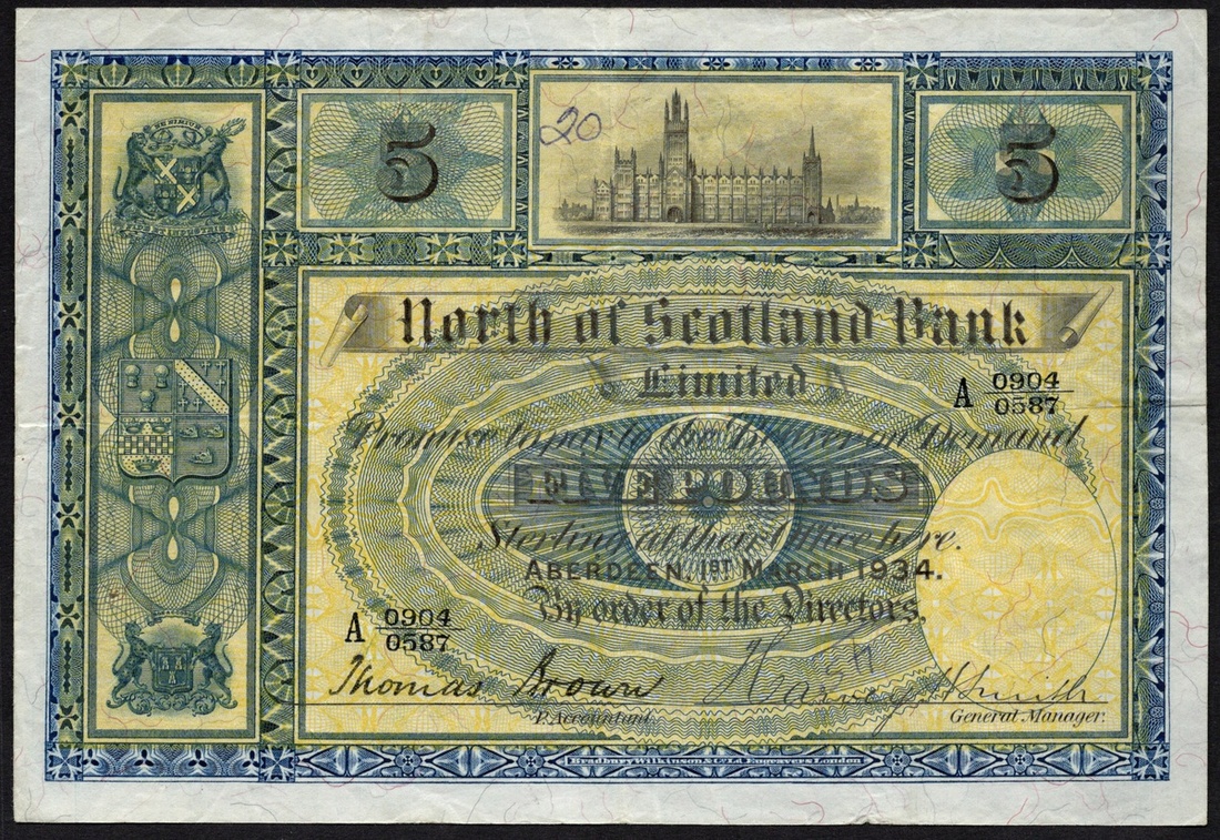 Scotland. North of Scotland Bank Limited. 5 Pounds. 1st March 1934. D.24; P-S640b. No. A 0904/0587. Blue and green on yellow. Marischal College top center. Inked number upper center. Otherwise About VF. Ex Baldwin Sale, Oct. 4, 2004, lot 2344.