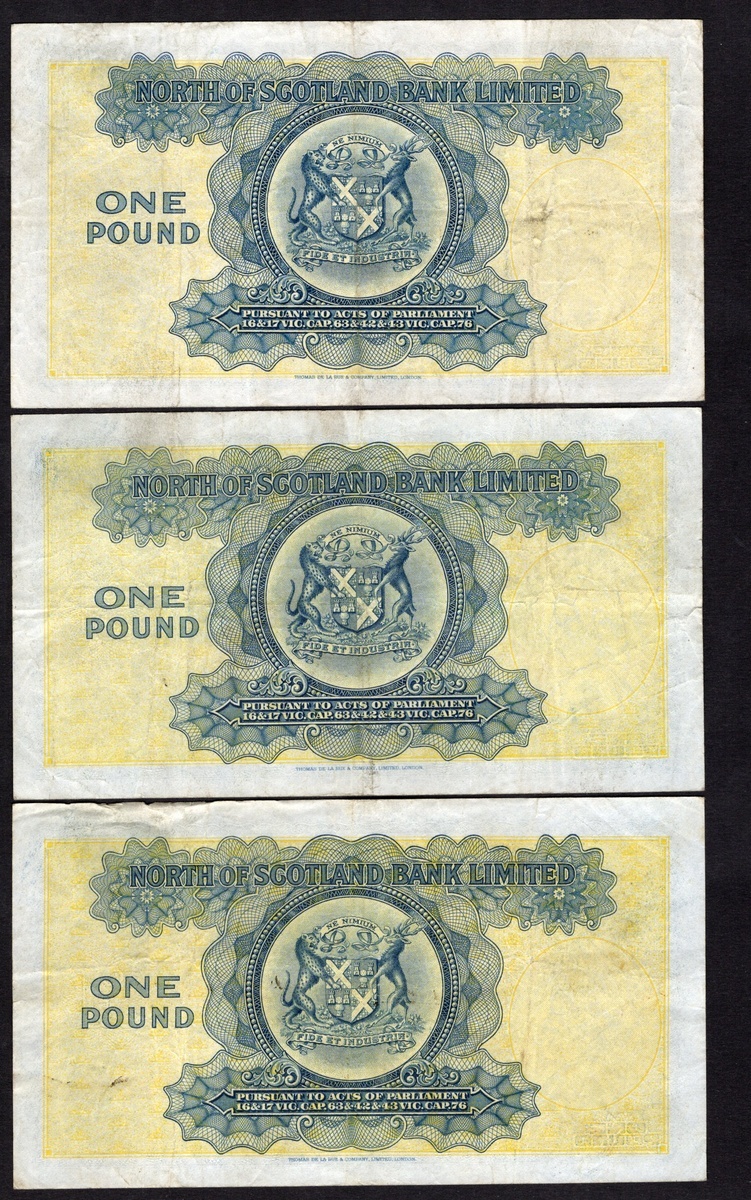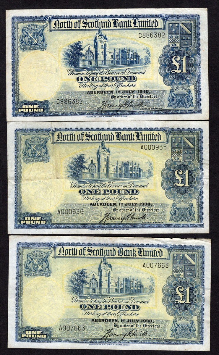 Scotland. North of Scotland Bank Limited. Trio of 1 Pound notes. Aberdeen 1 July 1938 (2), 1 July 1940. D.30-1; P-S644. King's College upper center; arms on back. Fine-Good Fine. [3]