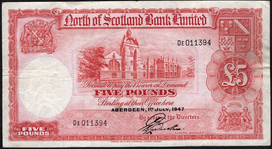 Scotland. North of Scotland Bank Limited. Pair of 5 Pounds. Aberdeen, 1st July 1947. D.31-1; P-S645. Red. Printed signature of G.L. Webster, General Manager. King's College top center, three coats of arms at left; Arms on back. Fine and About Very Fine. [2]