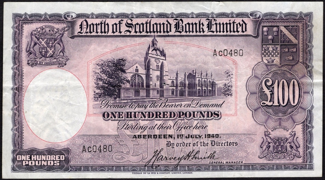 Scotland. North of Scotland Bank Limited. 100 Pounds. Aberdeen, 1st July 1940. D.33-1, P-S647. No. Ac0480. King's College upper center; Arms on back. Rare. Very Fine.