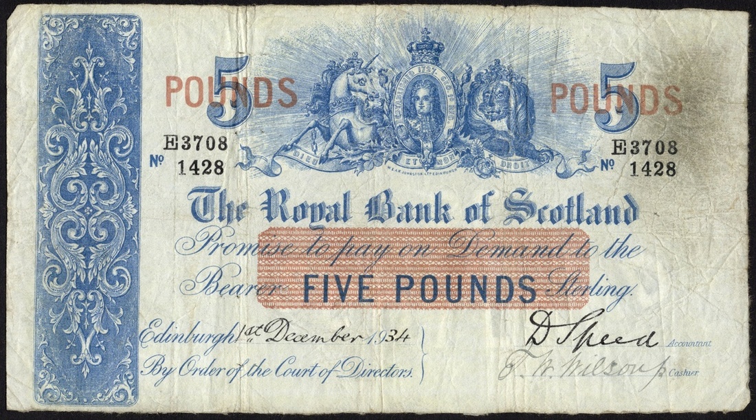 Scotland. Royal Bank of Scotland. 5 Pounds. 1st December 1934. D.42b-3; P-317b. No. E3708/1428. Blue and orange-brown on pale yellow. Crowned portrait with unicorn and lion upper center. Some soiling at right. Fine Ex Spink Oct. 2, 2003, lot 942.