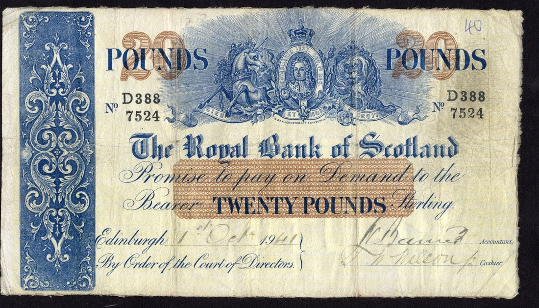Scotland. Royal Bank of Scotland. 20 Pounds. 1st Oct. 1941. D.44b-1, P-319b. No. D388 7524. Blue and brown. Crowned portrait flanked by lion and unicorn top center. Scarce. Fine, inked "40" upper right margin.