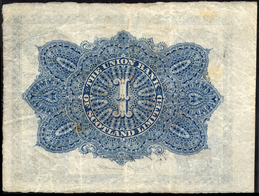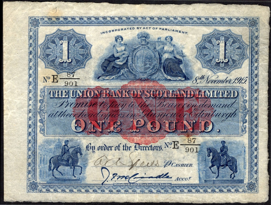 Scotland. Union Bank of Scotland Limited. 1 Pound. 8th November 1915. D.38-4; P-S805. No. E 87/901. Blue, value in maroon protector at center. Printed signature of J.F. McCrindle, Accountant and manuscript signature on behalf of Cashier. Equestrian statues lower left and right, bank Arms top center; large numeral value on back. Scarce. Good Fine. Ex. Dr. R.W. Pringle Collection, Banking Memorabilia Sale, April 23, 2005, lot 150.