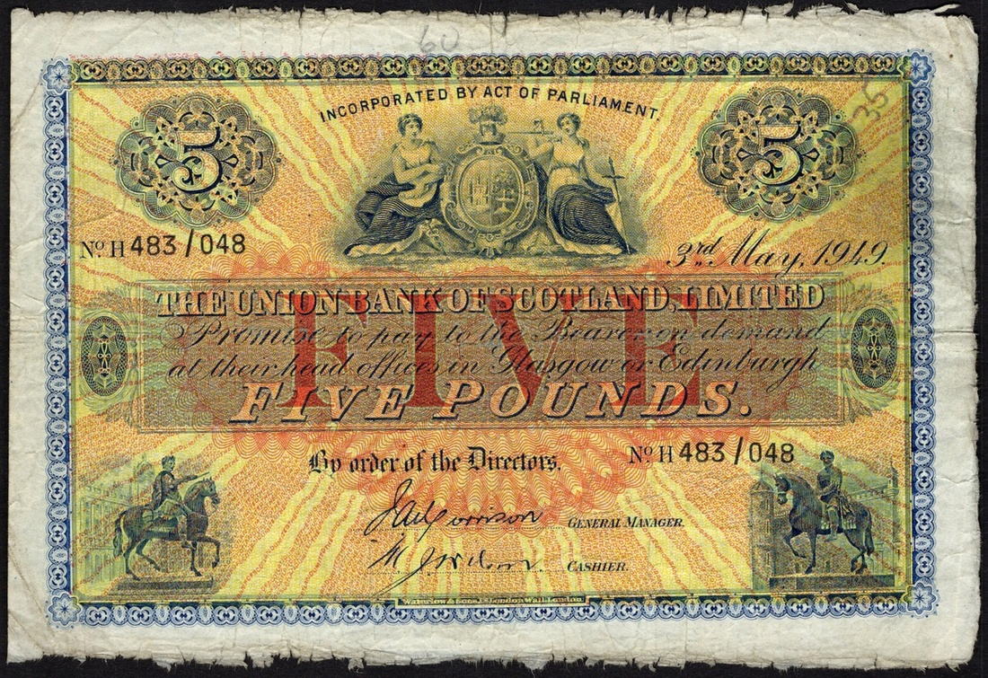 Scotland. Union Bank of Scotland Limited. 5 Pounds. 3rd May 1949. D.44-6; P-S811d. No. H483/048. Blue and red with orange sunburst. Equestrian statues lower left and right, oval Arms supported by two women upper center. Some nibbling on edges. Fine.