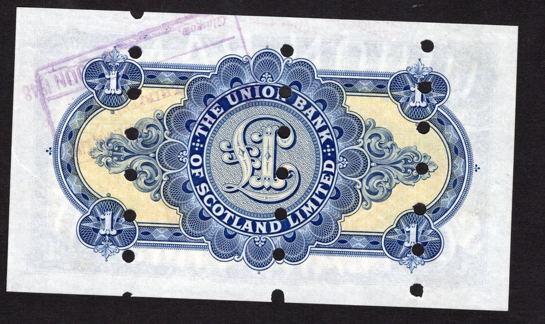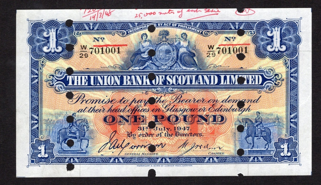 Scotland. Union Bank of Scotland Limited. Specimen 1 Pound. 31st July 1947. P-S815cs. No. W/29 701001. Blue, red, orange and yellow. Arms top center, equestrian statues bottom left and right. Red ink notations upper margin including date 14/3/48. Three rows of punches, purple bank stamp on back. Uncirculated. Ex R.M. Smythe Sale, July 11, 1996, lot 5600.
