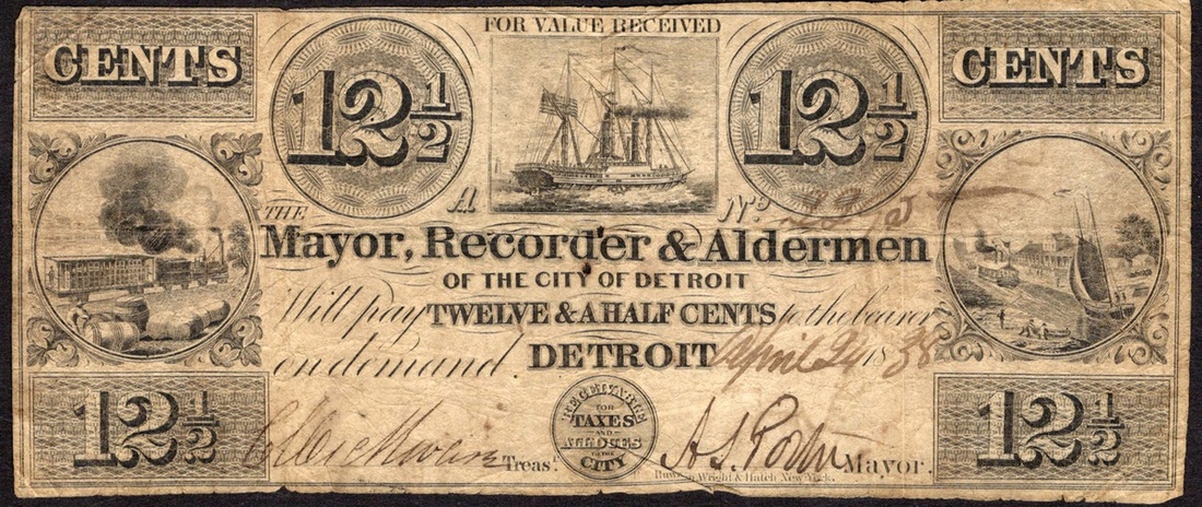 MI. Detroit. Mayor, Recorder & Alderman of the City of Detroit. 12 ½ Cents. April 24, 1838. No. 2295. Lee Det-13-2. Freight train at left, canal boats right, ship upper center. Very scarce. A few small holes at center, VG-Fine.