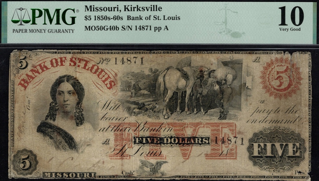 Missouri, Kirksville. Bank of St. Louis. $5. 18xx (1850s-1860s). No. 14871. Man carrying sack out of a mill near horse and foal at center, woman at left. Organized ca. 1857, the Bank of St. Louis remained in business in 1865 when it became the St. Louis National Bank. The Kirksville Bank which had been organized in November 1859 was liquidated around the same time. ABNC. PMG Very Good 10.