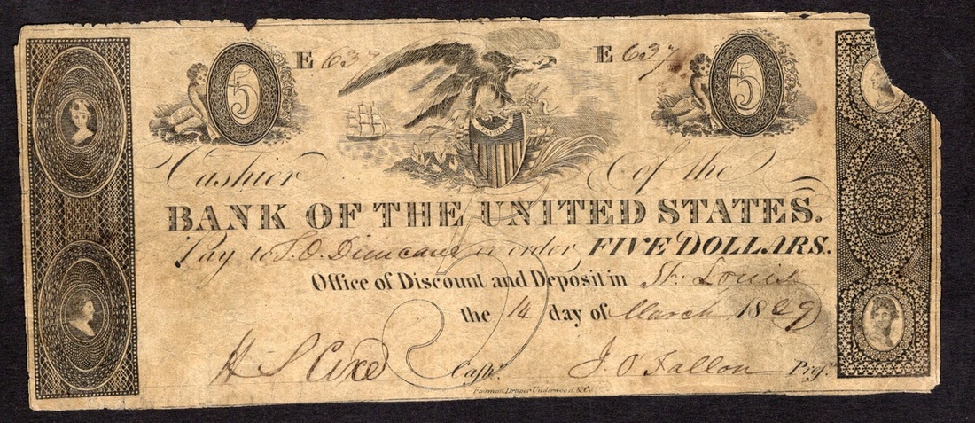 Missouri, St. Louis. Bank of the United States. $5. March 14, 1829. Cameo end panels, eagle and US shield upper center. Three signatures on back. Upper right corner torn off, some pinholes. Good.