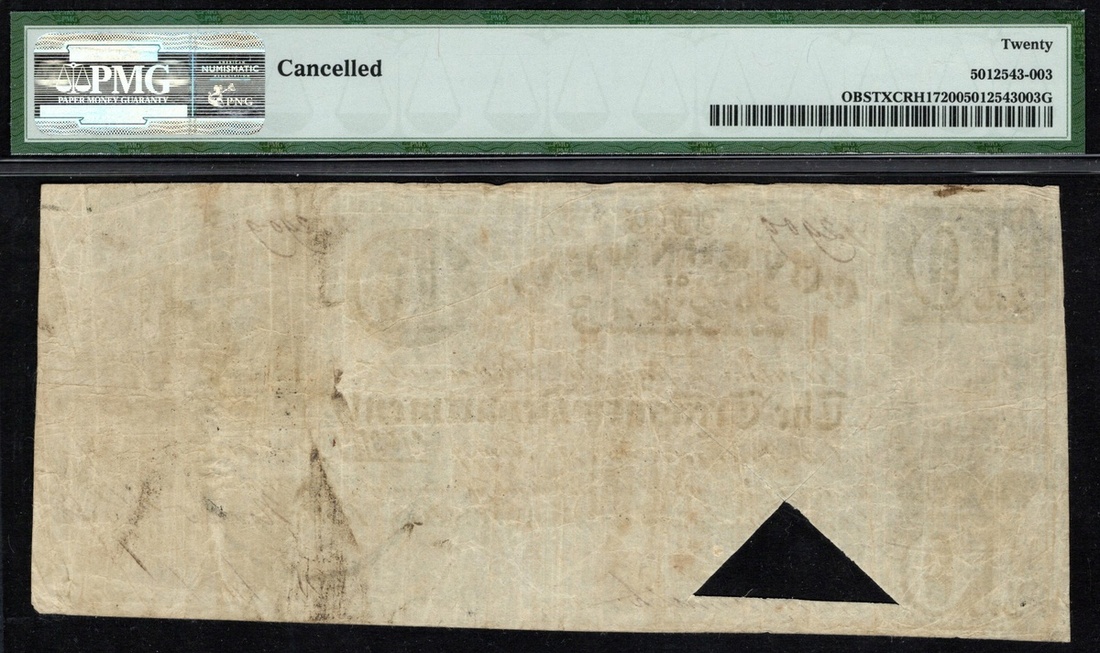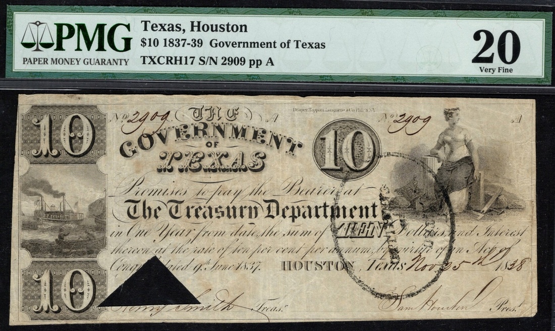 Texas. Government of Texas. $10. Houston, Nov 25th 1838. Cr.H17. Riverboat and rowboat at left, young woman upper right. Secretarial signed Sam Houston as President, Henry Smith as Treasurer. No. 2909, plate A. PMG Very Fine 20, cancelled (triangular cut-out and stamped).