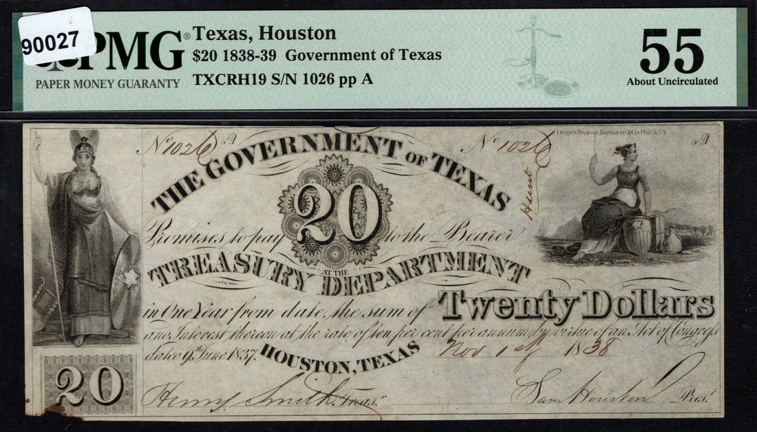 Texas. Government of Texas. $20. Houston, Nov. 1, 1838. Plate A, No. 1026. Texas standing with staff and shield at left, seated at right. PMG About Uncirculated 55, cut cancelled, ink burn.