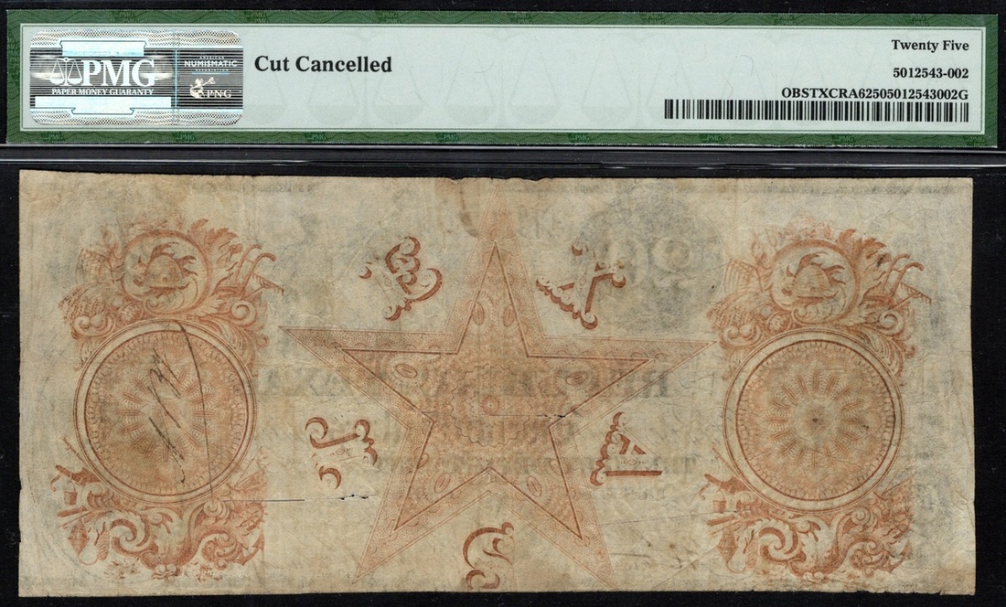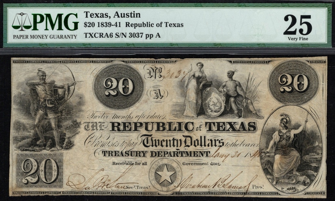 Texas. Republic of Texas. $20. Jany. 30 1840. Cr.A6. Native American warrior drawing bow at left, liberty and native American resting their arms on Lonestar shield at center, Minerva lower right. No. 3037, plate A. PMG Very Fine 25, cut cancelled.