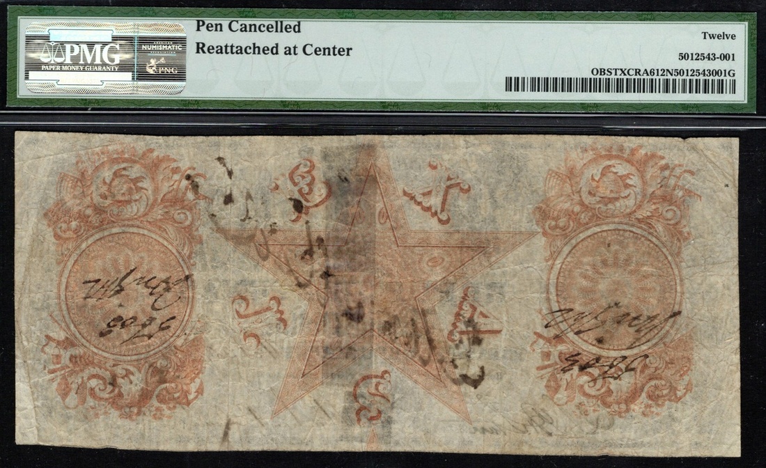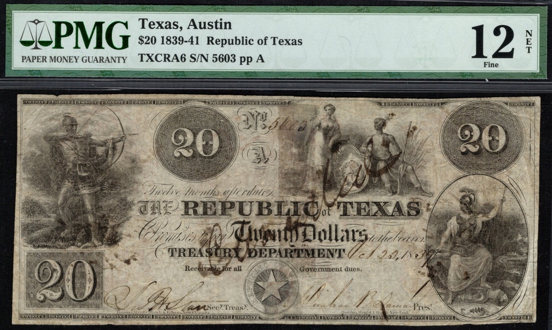 Texas. Republic of Texas. $20. Jany. 30 1840. Cr.A6. Native American warrior drawing bow at left, liberty and native American resting their arms on Lonestar shield at center, Minerva lower right. No. 5603, plate A. PMG Net Fine 12, pen cancelled, reattached at center.