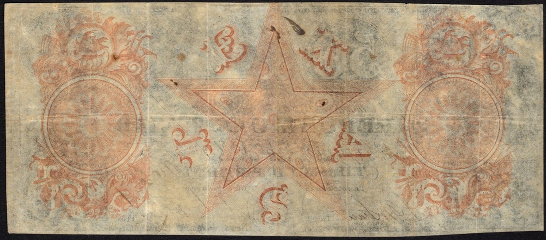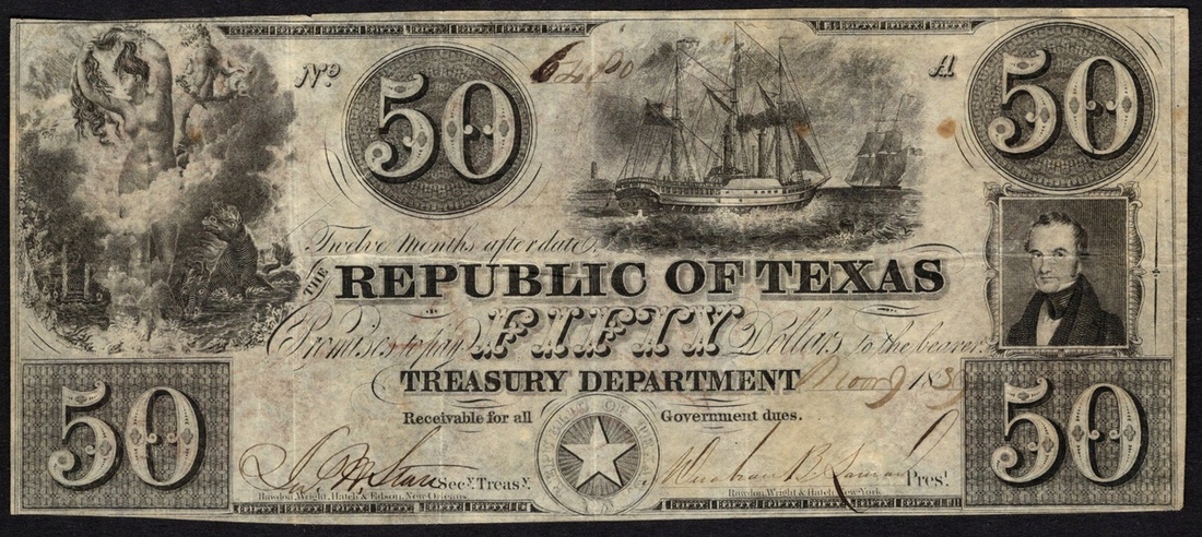 Texas. Republic of Texas. $50. 1839. Cr.A7. "Red Back". Venus at left, side-wheeler upper center right, Stephen Austin portrait at right; orange-red Lone Star on back. Engraved by Rawdon, Wright, Hatch & Edson, New Orleans - Rawdon, Wright & Hatch, New York. Cut cancelled. Very Fine.