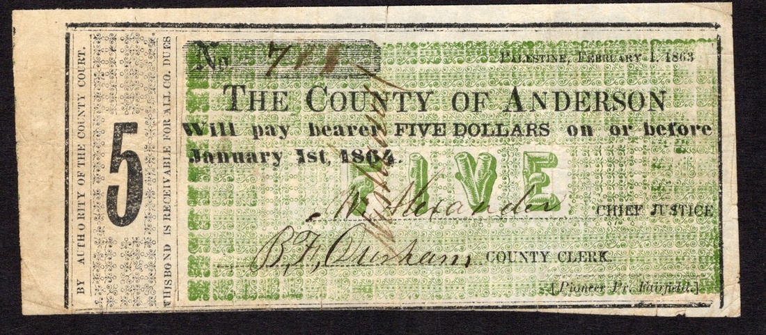 Texas. County of Anderson. $5. January 1, 1864. Medlar 8 (R-7). Green, large "5" in black end panel. VG-Fine.
