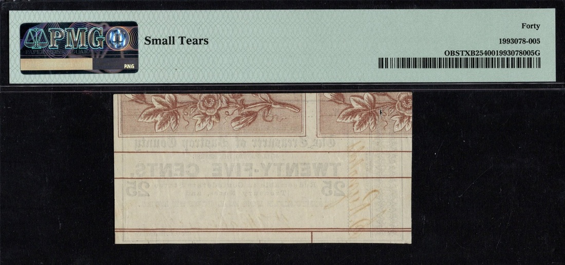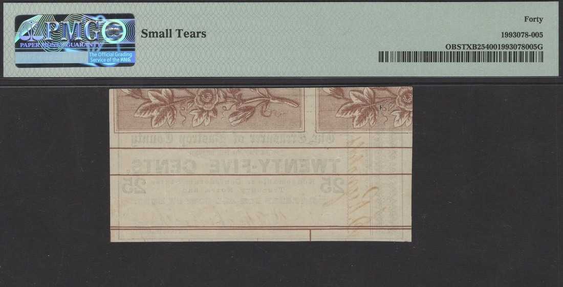 Texas, Bastrop County. Treasurer of Bastrop County. 25 Cents. Sept. 25, 1862. Medlar 7. No. 3621. Payable in Confederate treasury notes on July 1, 1863. Ex Schingoethe Collection, plate note, page 22, Medlar 7. PMG Extremely 40, small tears (not discernible through holder). Ex Heritage Sale, April 27, 2021, lot 84256.
