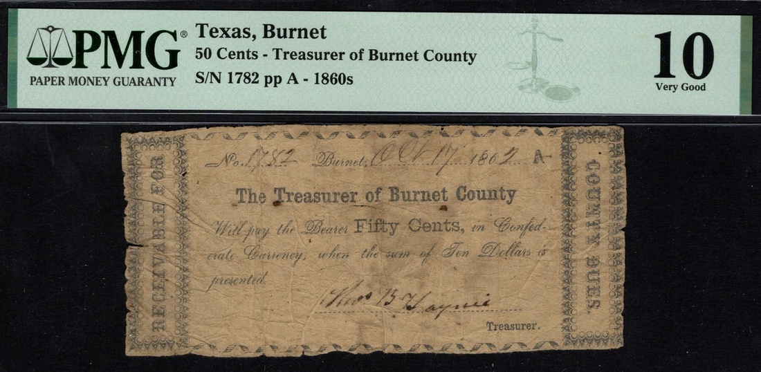 Texas. Treasurer of Burnet County. 50 Cents. Oct. 17, 1862. Medlar 2. No. 1782. Receivable for all dues to the county and redeemable in Confederate treasury notes when presented in sums of $10. Rare. PMG Very Good 10.