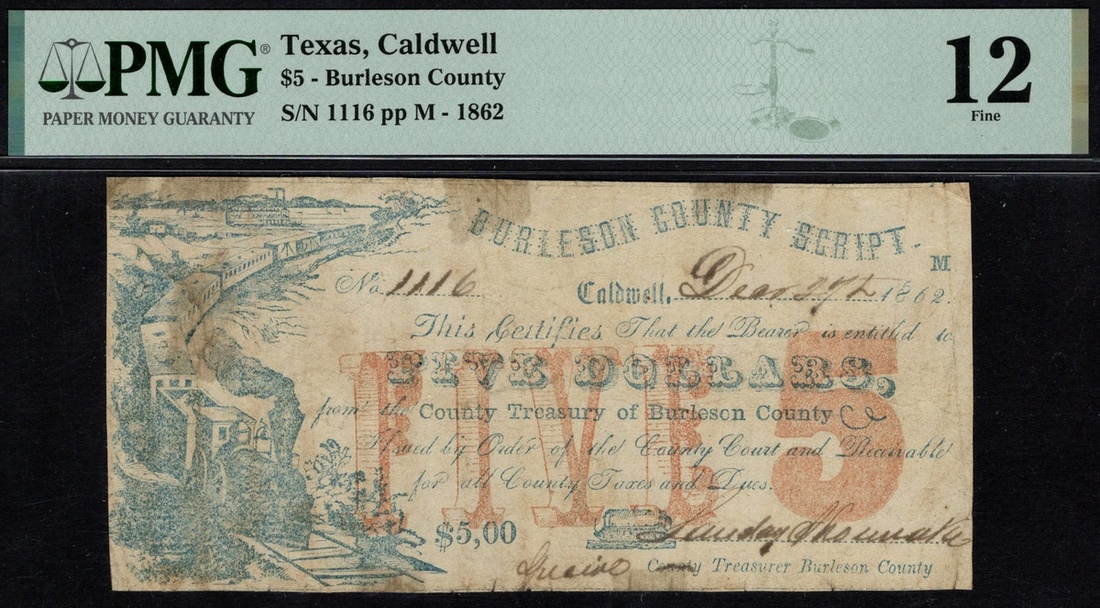 Texas, Caldwell. Burleson County Script. $5. Medlar 5. No. 1116. Well-detailed passenger train at left, small steamboat bottom center; TEXAS in cartouche on back. Rare. PMG Fine 12, repaired. Ex Heritage Sale, Jan. 16, 2022, lot 94036.