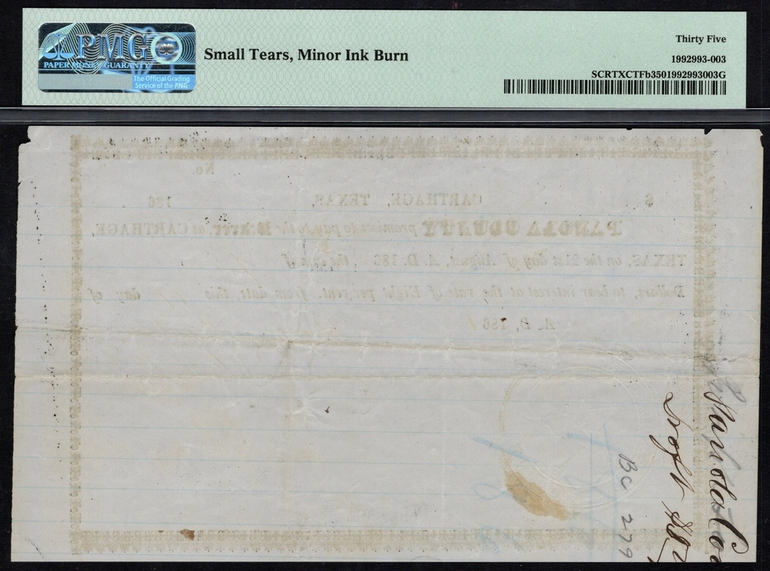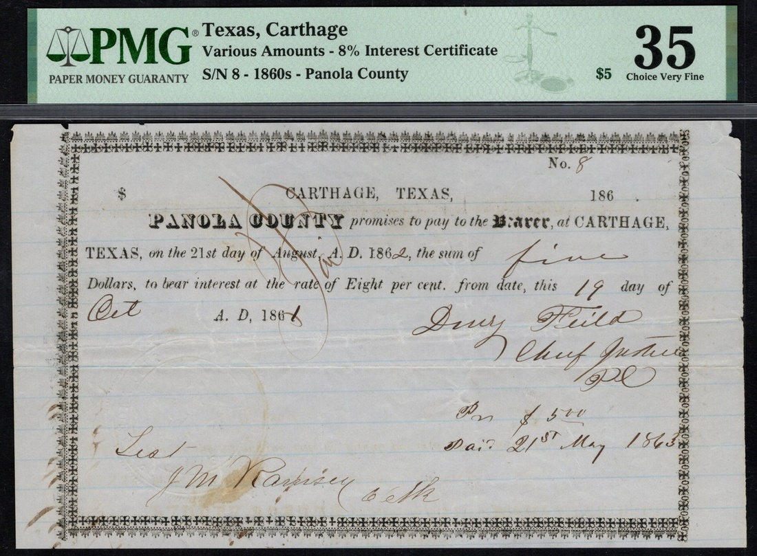 Texas, Carthage. Panola County. 8% Interest Certificate for the sum of $5. 19 Oct. 1861. Medlar 4. No. 8. Printed on ruled pale gray tablet paper. Very rare. PMG Choice Very Fine 35, small tears, minor ink burn.
