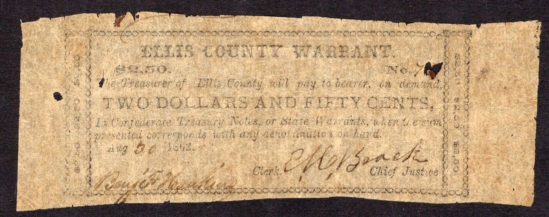 Texas. Ellis County Warrant. $2.50. Aug. 30 1862. Medlar 1. Title across top, denomination across center. Thin, tan paper. Small body holes and edge splits. Very Fine.