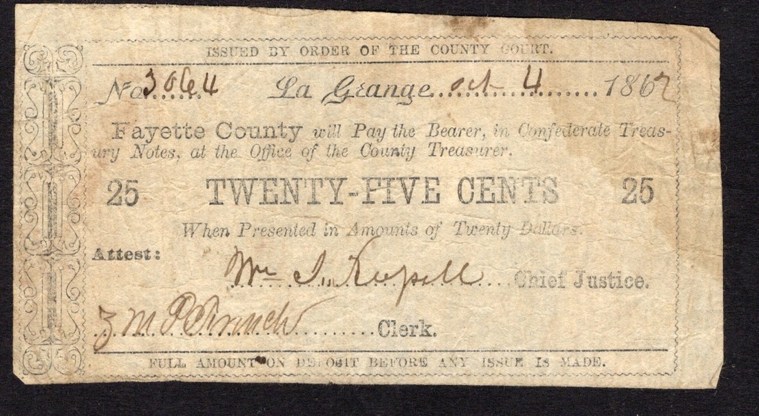 Texas. Fayette County. 25 Cents. La Grange, Oct. 4 1862. Medlar 1 (R-7). No. 2064. Very Good+.