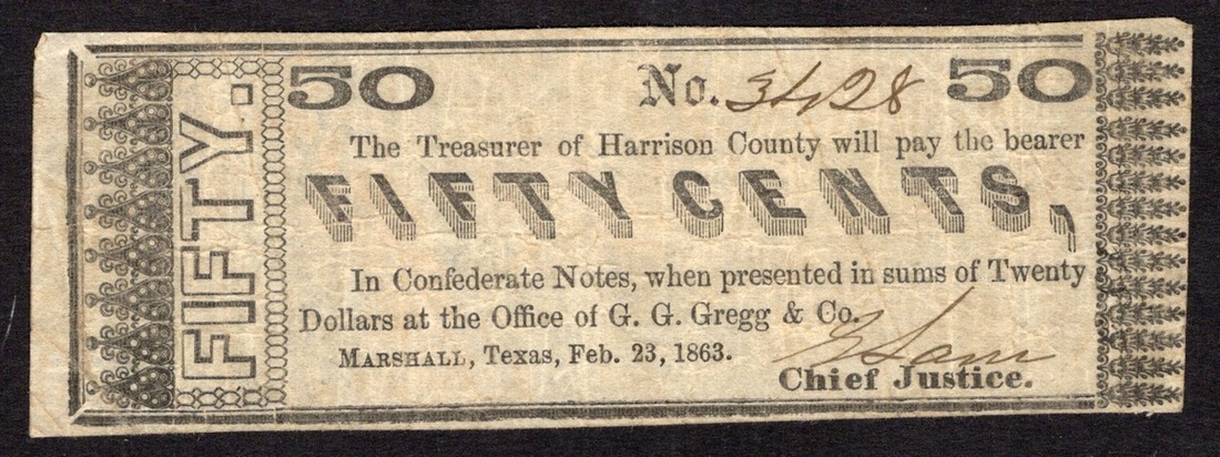 Texas. Treasurer of Harrison County. 50 Cents. Marshall, Feb. 23 1863. Medlar 11. "Fifty Cents in Confederate Notes when presented in sums of Twenty Dollars at the office of G.G. Gregg & Co." No. 3428. Rare. Fine-VF.