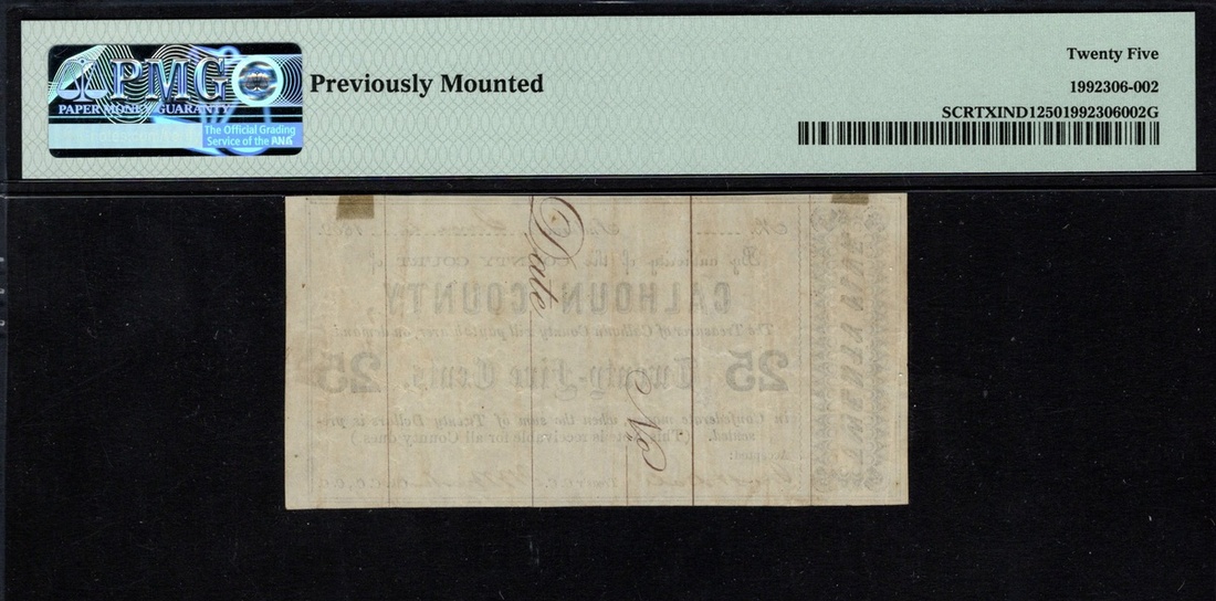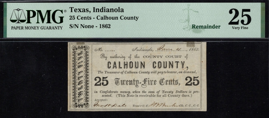 Texas, Indianola. Treasurer of Calhoun County. 25 Cents. June 4, 1862. Medlar 1. Printed on the back of a fiscal instrument. Redeemable in Confederate treasury notes when presented in sums of $20 and receivable for all county dues. Remainder. PMG Very Fine 25, previously mounted.