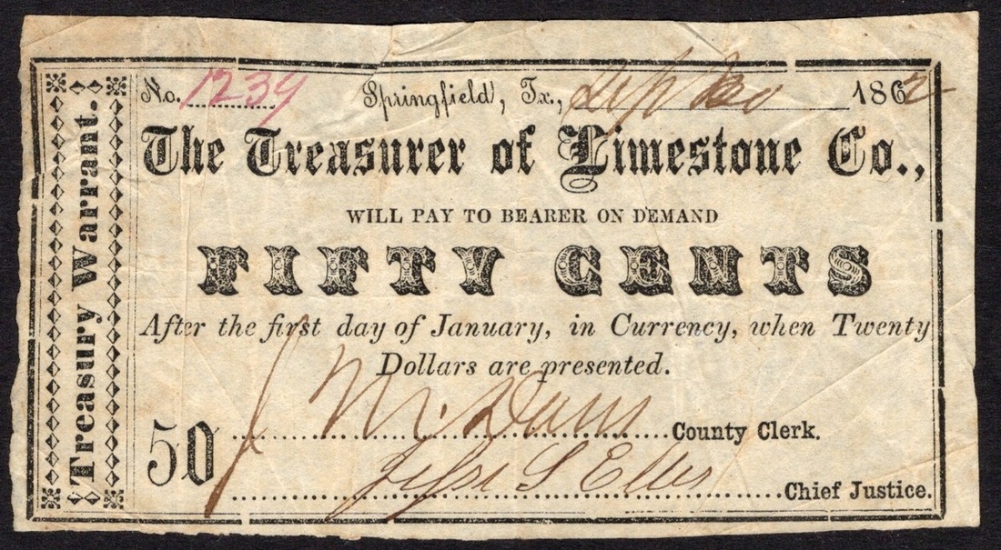 Texas. Treasurer of Limestone County. 50 Cents. Springfield, Sept. 20 1862. Medlar 8. "Treasury Warrant" in frame at left. No. 1234. Fine.
